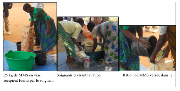 2Après qu'on eut retiré 1 kg de 8 des sacs de 25 kg, le MMS a été réparti en rations complètes de 8 kg.