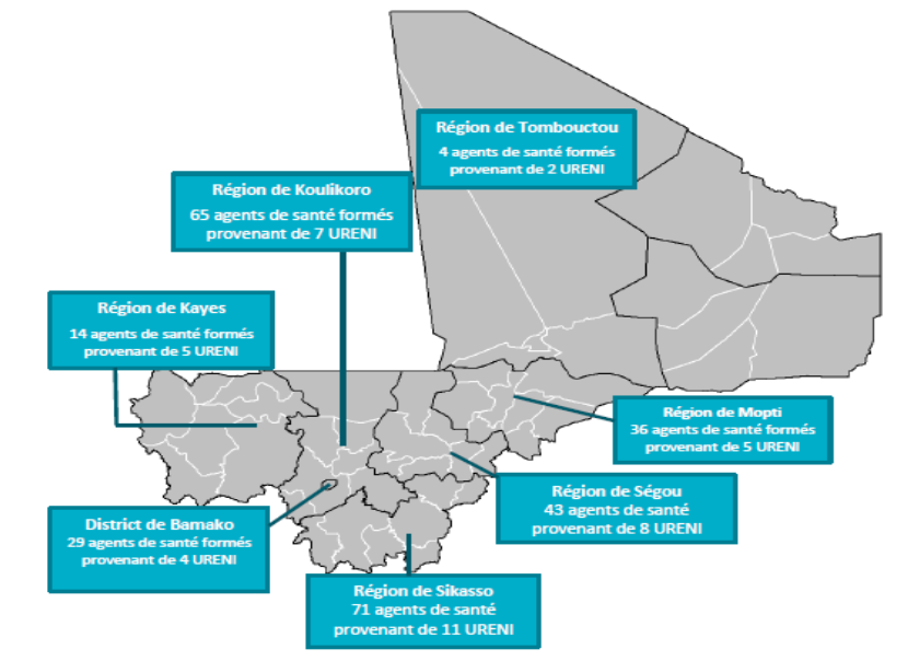 Entre août 2015 et avril 2017, le projet a formé un total de 262 agents de santé maliens, dont 67 médecins, provenant de 41 districts sanitaires. La figure 1 illustre les régions d'origine des agents de santé. Les stagiaires ont été repérés par UNICEF en collaboration avec le CSREF d'origine et ALIMA. La priorité a été accordée aux CSREF qui n'étaient soutenus par aucune ONG pour des activités liées à la nutrition. Les stagiaires ont été évalués sur 40 procédures médicales et de soins infirmiers. Au total, 22 formations ont été dispensées et ont eu un taux de réussite de 100% (tous les stagiaires ont obtenu plus de 50% lors de l'examen final). À la fin de la formation pratique, tous les participants ont su appliquer les normes de soins nationales et internationales pour les MAS avec complications.