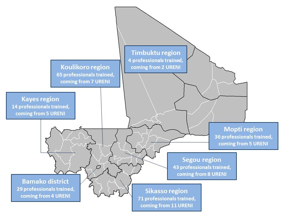 Regional nutrition focal points (NFPs) oversee monitoring the integrated management of acute malnutrition (PECIMA) at the regional level and have an important role in the supervision and evaluation of the URENIs and their staff. They are employed by the DN, which is part of the National Office for Health, under the responsibility of the MoH. One NFP per sanitary district has been deployed in accordance with the PECIMA. Monitoring and evaluation tools used by NFPs include a performance evaluation grid, designed by the MoH to monitor and evaluate the URENIs. Data provided by NFPs are reviewed by each Regional Health Director and then sent to the national-level DN. The NFPs in Koulikoro, Bamako, Mopti, Ségou and Kayes have benefited from a refresher course at the URENI school, helping to improve their techniques for monitoring and evaluating all URENIs. NFP training focused on frequency of supervision, use of existing monitoring tools, editing supervision reports and data collection. The follow-up plans produced by trainee doctors and nurses in their region were shared with the relevant NFP.