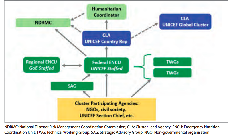 The ENCU participates in and chairs meetings across the GoE partners and donors to ensure cohesion of nutrition emergency-related information, planning and response. The ENCU co-chairs with NDRMCC monthly Nutrition Cluster meetings, known as the Multi-Agency Nutrition Task Force (MANTF), to address bottlenecks in planning and implementation. In addition, the ENCU and NDRMC co-chair the quarterly Strategic Advisory Group (SAG), with representation from the Federal Ministry of Health (FMoH) as well as elected partners from United Nations (UN) agencies, donors and NGOs. The SAG provides strategic guidance in formulating and reviewing the cluster strategy. Finally, extraordinary Technical Working Groups (TWGs) are established to discuss specific technical issues that may arise. At the regional level Nutrition Clusters are chaired by the Regional Health Bureau (RHB), with the ENCU nutritionist and/or IMO providing secretariat support.