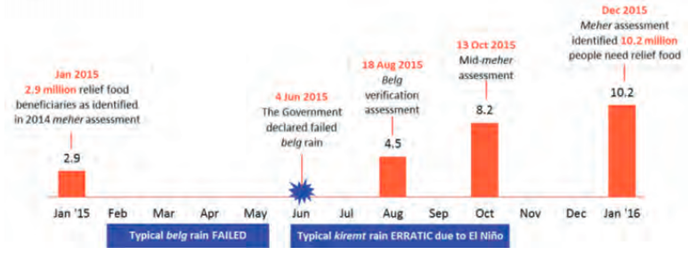 For the El Niño drought, the belg assessment in June-July 2015 concluded that 4.5 million people would be in need of emergency food assistance in August 2015. Following the erratic summer rains, the GoE decided to conduct a pre-harvest, rapid multi-agency assessment in early October 2015, which concluded that the number of people in need of assistance had increased to 8.2 million. This was followed by the meher assessment in late October, which revised the number further upwards to 10.2 million (Figure 2). This formed the basis of the 2016 HRD appeal for US$1.4 billion, of which US$115.4 million (US$135 million including NGO support) was needed for the nutrition response.