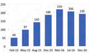 Based on the meher and belg assessments, the Household Economic Assessment (HEA) data, food security and early warning assessments, SMART surveys, disaster area assessments and routine programme data from multiple sectors, the regional and federal ENCUs lead a series of meetings at regional and then federal levels to classify woredas into different hotspot priorities to signal varying levels of vulnerabilities (Figure 3). During the El Niño drought, the number of priority one woredas – those in utmost need of humanitarian interventions –steadily increased from 49 in February 2015 to 186 in December 2015, reaching a peak of 219 in March 2016 (Figure 4).