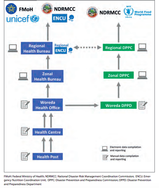 To avoid duplication and utilise the comparative advantage of each agency, WFP took the lead in supporting the NDRMCC with the treatment of MAM, whereas UNICEF, along with the World Health Organization (WHO), supports the FMoH in strengthening the overall health system to identify and provide quality and timely treatment for SAM and provide key preventative interventions. Considering the high caseload of acute malnutrition and the subsequent burden on the health system, NGO support to the woreda sector bureaus has been essential to ensure that quality services reach the most vulnerable and hard-to-reach. This is further illustrated in Andert et al (2016).