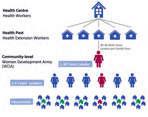 The emergency nutrition response is delivered primarily through the Health Extension Programme (HEP), implemented by government-employed health extension workers (HEWs) with support from partners. Under the HEP, the FMoH has built at least one health post and assigned two HEWs per kebele (sub-district) to provide preventative and basic curative services. At the community level the Women Development Army (WDA), a network of volunteers, links the neighbourhood with HEWs and is responsible for behaviour change communication (BCC) and community mobilisation (Figure 6). Some five health posts are supported by one health centre, staffed by nurses and providing more advanced curative services. Hospitals in densely populated towns and cities provide tertiary treatment for cases with severe complications.