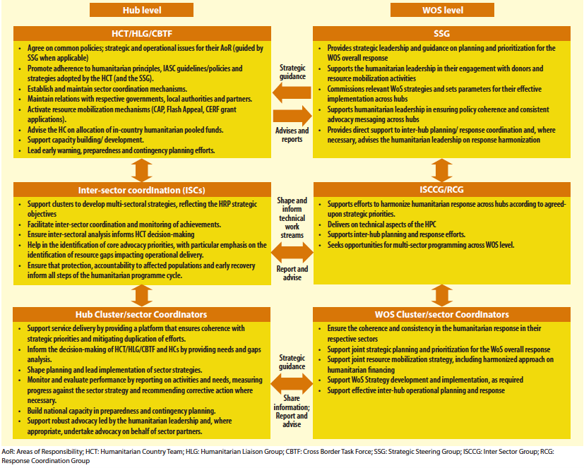 The WoS Nutrition Sector1 is part of the overall WoS structure that comprises sector-specific leads (UN agencies) and co-leads (NGOs) and the Inter-Sector Coordination Group (ISG), chaired jointly by the UN Office for the Coordination of Humanitarian Affairs (UNOCHA) and international NGOs, with participation of the sector lead/co-lead at the WoS level (see Figure 1 for coordination structure). A Strategic Steering Group (SSG) sits above the ISG, with representatives from key UN agencies and the NGO regional forum. The Nutrition Sector for the WoS provides technical and policy advice through the ISG to the WoS SSG to support decision-making throughout the humanitarian planning cycle. Final and strategic decisions regarding WoS coordination are made by the SSG.