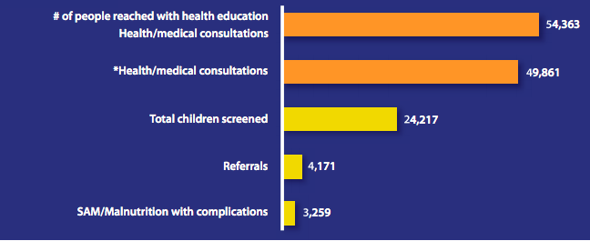• Dépistage de la circonférence du Milieu du bras (MUAC) et identification des enfants souffrant de malnutrition.