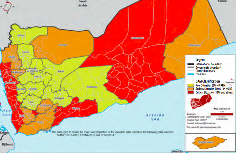 Depuis mars 2015, le conflit s'est envenimé au Yémen; il y a maintenant plus de deux millions de personnes déplacées à l'intérieur du pays (PDI) et sur une population totale de 27,4 millions, 20,7 millions ont besoin d'aide humanitaire. On estime à 17 millions le nombre de personnes (60% de la population totale) souffrant d'insécurité alimentaire, dont 10,2 millions se trouvent en situation de crise (phase 3) et 6,8 millions en situation d'urgence (phase 4), selon le Cadre intégré de classification de la sécurité alimentaire (IPC). L'illustration 1 montre la classification des gouvernorats au Yémen en fonction de la prévalence de la malnutrition aiguë globale (MAG). La prévalence de la malnutrition aiguë est élevée, le nombre d'enfants de moins de cinq ans souffrant de malnutrition aiguë sévère (MAS) et de malnutrition aiguë modérée (MAM) étant estimé à 400 000 et à 1,8 million respectivement. On évalue à 14,5 millions le nombre de personnes ayant besoin d'assistance en matière d'eau potable, d'assainissement et d'hygiène (WASH) et à 14,8 millions celles qui ont besoin d'aide pour avoir un accès adéquat aux soins. Selon le système de cartographie des ressources de santé disponibles (HERAMS), il y a seulement 50% des structures sanitaires qui sont aujourd'hui complètement opérationnelles. Le choléra est aussi un problème avec plus de 750 000 cas suspects en octobre 2017.