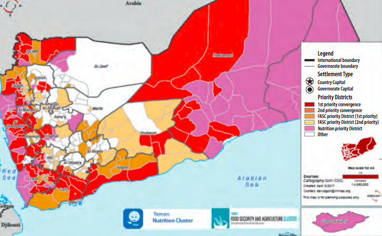 En 2017, il y a eu une réelle réorientation vers un programme de nutrition intégré (multi-secteurs) à la suite de la classification IPC relative à l'insécurité alimentaire aiguë au Yémen en février de la même année. Avec l'augmentation du risque de famine, il y a eu une prise de conscience générale de la complexité de la situation qui n'est pas uniquement liée à la malnutrition mais à des facteurs causaux sous-jacents. Le lien direct avec la sécurité alimentaire était clair puisque les indicateurs de famine utilisés par le comité technique IPC sont en grande partie liés à la sécurité alimentaire (mortalité + prévalence de MAG + consommation alimentaire ou changement de moyens de subsistance ou analyse documentée par inférence fondée sur au moins quatre preuves fiables (directes ou indirectes) sur les facteurs contribuant à la sécurité alimentaire ou sur les résultats).