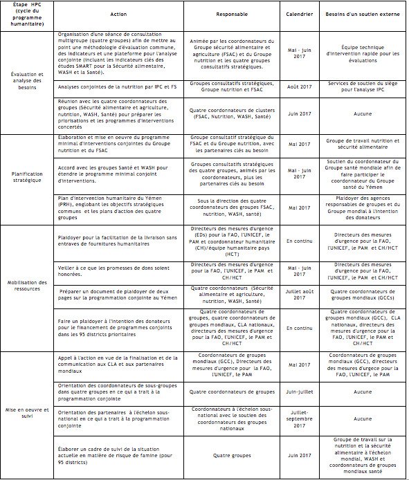 Des évaluations SMART doivent maintenant être augmentées proportionnellement au Yémen et PCI joints et l'analyse de nutrition effectuées. Le paquet de réponse commun doit être operationalisé au niveau sous-national. Le EHP au Yémen est actuellement en développement et le plaidoyer continu est exigé pour la planification jointe, la mobilisation de ressource et la réponse. Un support de niveau mondial est nécessaire pour faciliter l'atelier d'inter-groupe au Yémen sur la programmation jointe avec les quatre groupes. Les partenaires GNC devraient réfléchir sur leur capacité à programmer les quatre groupes communs et sur les changements à mettre en œuvre au niveau organisationnel pour permettre cela. Le support (à al fois technique et en termes de ressources humaines) au Yémen est nécessaire pour des ONG internationales et agences de l'ONU et pour assurer le contrôle constant de leur performance.