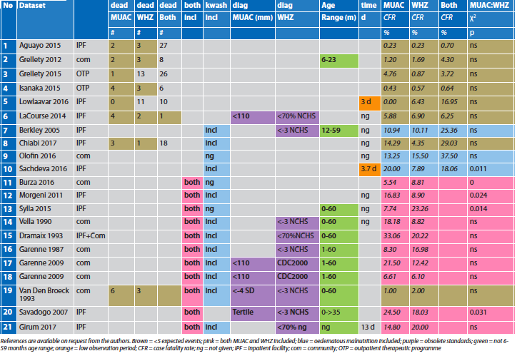 We retrieved 21 datasets that compared WHZ and MUAC mortality rates. Table 3 shows the problems with the interpretation of the reported CFRs. Statistically, to get reliable results, the expected deaths in each group should be at least five. The reports marked in brown had insufficient deaths to make analyses of individual studies reliable. Most of the “brown” studies had many more children fulfilling the “both” category; as shown with the empirical data this also makes the analyses reported by the authors subject to mathematical coupling and are thus unreliable. The reports marked in pink each suffer from the same criticism by including individual children with both SAM by WHZ and MUAC criteria into the MUAC and WHZ groups; the analyses are therefore flawed. Children fulfilling both criteria would be identified with all screening strategies and not excluded from treatment. The papers marked in blue included oedematous children in the analysis; as oedema greatly increases the mortality risk, this confounding further increases the unreliability of the reports. The purple columns indicate the papers which used obsolete standards. This affects the CFR because more stringent criteria include more severely affected children in the cohort resulting in a higher CFR; less stringent criteria have the opposite effect, so that a lower CFR is expected when less severely affected children are considered to have SAM.