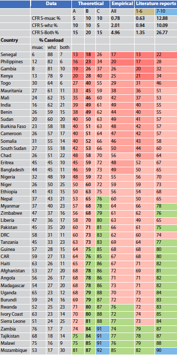 If there are 100 children with SAM by WHZ with a CFR of 10 per cent and 50 children with SAM by MUAC with a CFR of 20 per cent then, even though the CFR of the MUAC children is double the WHZ CFR, children from each group will have ten SAM-related deaths. As the relative caseload varies widely from country to country, it is a more important determinant of the number of SAM-related child deaths than the relative CFR. We have taken the relative caseloads from Grellety and Golden (2016) and estimated the proportion of all SAM deaths that would be identified and admitted to a MUAC-only programme. We examine the effect of various estimates of CFR for children with a WHZ <-3Z and MUAC <115mm, using 1) theoretical consideration where the CFR is half, the same or double that of the alternative diagnosis and those with both deficits having the sum of the CFRs; and 2) the CFRs derived from the empirical data and the published reports. The results are shown in Table 4. The most likely scenario is given in theoretical simulation B, where the two defects have the same CFR and those with both defects have double the risk of death.