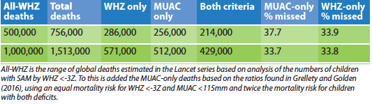 Table 5: Estimation of the possible global deaths from SAM that would be missed using a MUAC-only programme