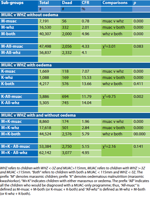 When all the children’s data are considered together, WHZ-related death rate was higher than MUAC-related deaths; those who had both deficits had about twice the CFR as those with a single anthropometric deficit. When those with both a low WHZ and a low MUAC were included in the WHZ and MUAC data, the relative CFR is reversed. This demonstrates that inclusion of children with both deficits into both the WHZ and the MUAC group results in erroneous interpretation of the relative mortality rates.