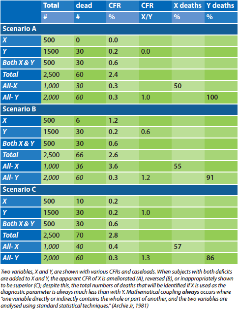 Table 2: An illustration of the effect of mathematical coupling to create Simpson’s paradox