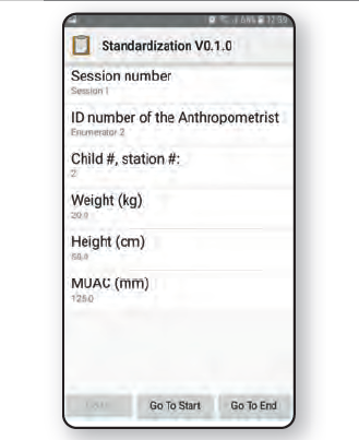 During the standardisation test, up to 20 enumerators measure ten children, usually aged between 18 and 59 months. Each measurement is repeated twice by each enumerator for each child, with a time interval between both rounds of measurements. Collecting all measurements takes between half a day and a full day, which is exhausting and tiring for both the survey team and the children. At the end of the day the measurements are compared with reference data collected by the trainer and that information is used to determine which enumerators are capable of which role, or whether some enumerators need additional training prior to the start of the survey. Until now, the facilitator has manually entered the captured data into a spreadsheet at the end of the day, a process that took a considerable amount of time and was a potential source of data input errors.