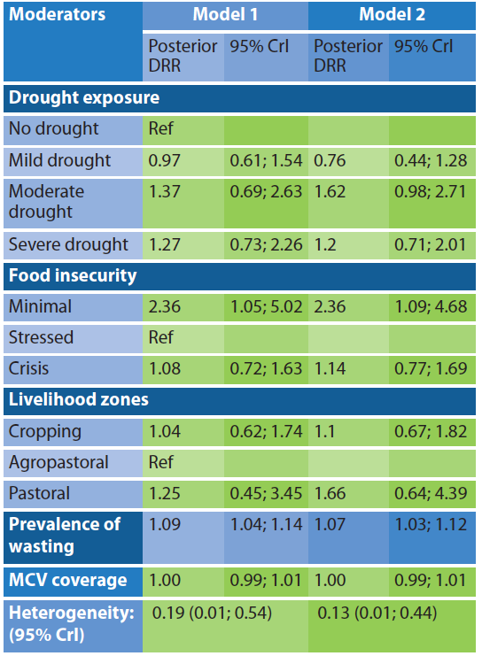 Statistical analysis: The datasets were merged across space and time and a random-effects meta-analysis was undertaken to summarise survey results and explore heterogeneity across independently conducted but methodologically similar small-scale surveys. Variability was explored across the survey estimates using the between-survey variance statistic. To explain the variability, meta-analyses were performed on sub-groups based on survey-specific contextual moderators (drought exposure levels, food insecurity and livelihood zones). A meta-regression analysis was subsequently undertaken, adjusting for additional moderators, prevalence of wasting and MCV coverage. A fifth of included surveys had zero counts for U5DR, leading to undefined variance estimates. To circumvent this problem, the Poisson regression model was used for meta-analysis in a Bayesian framework.