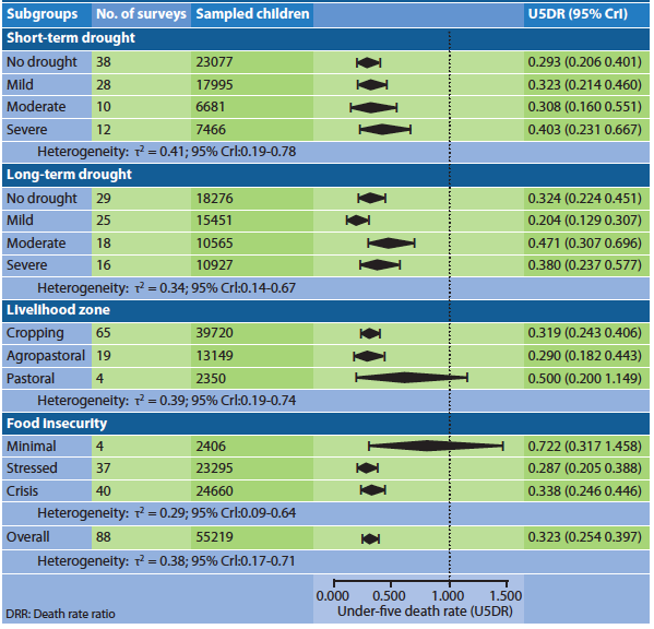 Figure 1: Pooled U5DR and 95% credible intervals, stratified by short and long-term drought exposure, food insecurity and livelihood zones from 88 small-scale mortality surveys from Ethiopia, 2009-2014.