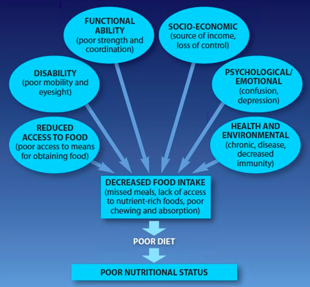 Dans les zones des pays en voie de développement sujettes aux catastrophes, les facteurs déterminants pour que les gens puissent survivre aux tensions, aux bouleversements et s'en remettre sont une alimentation et des apports nutritionnels suffisants, ce qui est aussi essentiel pour se maintenir en bonne santé. Les personnes âgées ont des besoins spécifiques en ce qui concerne leurs apports alimentaires en général, leurs besoins micronutritionels et la saveur des aliments (Graphique 1). Cela les rend particulièrement vulnérables aux dérèglements en matière de sécurité alimentaire en période de crise. Quand il y a sécheresse ou pénurie alimentaire, quand le prix de la nourriture est en général élevé, les personnes âgées, qui font souvent partie des personnes les plus pauvres, n'ont, la plupart du temps, pas les moyens d'acheter assez de nourriture pour eux-mêmes et leurs familles. De plus, quand il y a insécurité alimentaire, les personnes âgées choisissent souvent de donner leur part de nourriture aux plus jeunes de la famille.