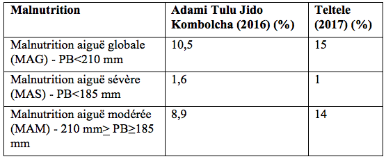HelpAge a mené deux évaluations rapides de la santé et de la nutrition dans la woreda Adami Tulu Jido Kombolcha1dans la zone Est Shewa (2016) et dans la woreda Teltele dans la zone Borena (2017). Les deux évaluations ont révélé des niveaux élevés de malnutrition aiguë chez les personnes âgées, et même un taux préoccupant de malnutrition aiguë globale (MAG) de 10,5 pour cent dans l'Adami Tulu Jido Kombolcha et un taux critique de MAG de 15 pour cent dans la Teltele. L'évaluation dans l'Adami Tulu Jibo Kombolcha a été menée dans une zone de production dite belg2, suite à une mauvaise récolte durant la saison dite meher, ce qui, dans une certaine mesure, explique le taux élevé de malnutrition (Il n'y a pas non plus de données de base disponibles pour pouvoir faire la comparaison avec les autres saisons). Pour faire ces évaluations, la méthode d'évaluation rapide pour les personnes âgées (RAM-OP) développée en 2013 par HelpAge en collaboration avec Brixton Health et Valid International a été utilisée. Il n'est pas recommandé d'évaluer les œdèmes bilatéraux prenant le godet chez les personnes âgées. En effet, dans cette tranche d'âge, il peut y avoir œdème à cause d'autres problèmes de santé courants. Les résultats de ces deux évaluations sont résumés dans le tableau 2.