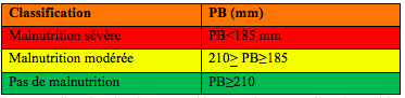 Dans le cadre de l'intervention menée par l'équipe de projet, la communauté a été fortement mobilisée; et ce, avec le soutien du gouvernement au niveau des woredas et au niveau des communautés au sein des deux districts (AVS, agents de développement et dirigeants communautaires). Suite à cette mobilisation, les AVS, assistés du personnel travaillant sur le projet, ont procédé au dépistage de la malnutrition aiguë chez les personnes de 60 ans et plus à l'aide de simples bracelets à code couleur pour mesurer le PB (pour la classification, voir le tableau 2).