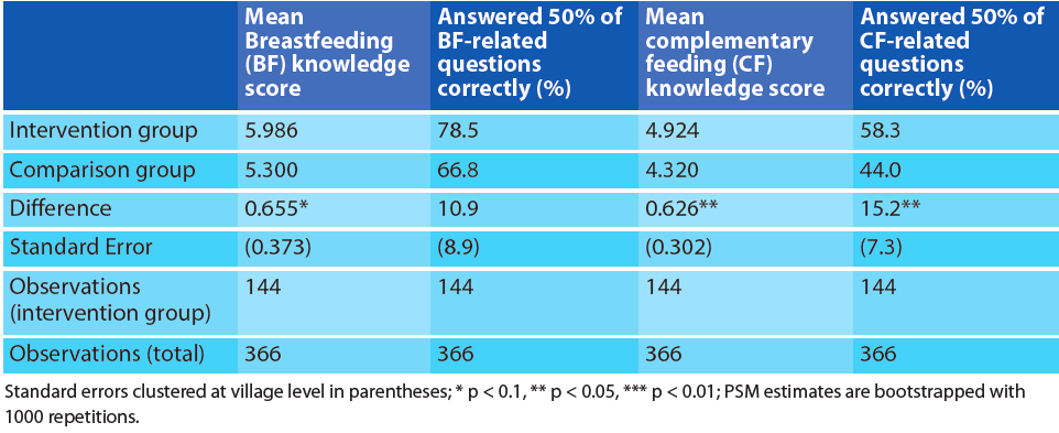 A set of ten questions was developed to assess mothers’ knowledge on breastfeeding (BF) and complementary feeding (CF), which were combined to create a BF knowledge score and a CF knowledge score. As indicated in Table 1, on average mothers from intervention villages scored 6.0 out of 10 on the breastfeeding knowledge scale, compared to an average score of 5.3 among the comparison group. Statistical evidence supporting this difference is weak in the primary analytical model. However, considering the fact that the robustness tests (with alternate models) suggest very strong significance, the project is likely to have had a positive impact on knowledge of breastfeeding (please contact the authors to see the full report).