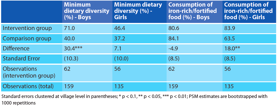However, the percentage of children receiving a minimum acceptable diet (MAD) was actually higher among comparison group (17%) compared to the intervention group (13%), although the difference was not statistically significant. The evaluation did not find any evidence of impact on the early initiation of breastfeeding and no significant impact on exclusive breastfeeding (24 hour recall). There was strong evidence that the intervention had a positive impact on girls’ consumption of iron-rich or iron-fortified foods, although the overall impact across both genders was not statistically significant (Table 2).