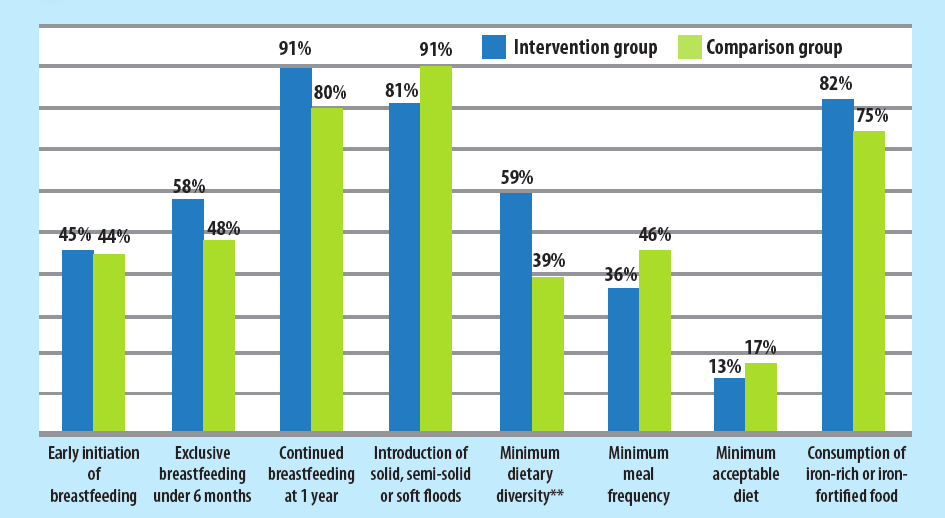 Review of this project demonstrates the potential but also the progamming and likely social and economic complexities behind delivery of an effective, community-based IYCF support group model. The intervention impacted IYCF knowledge but had limited impact on practice and no impact on stunting or acute malnutrition. Future community-based IYCF support group interventions should be informed by barrier analysis, delivered at the intensity stipulated in the intervention plan, and use multiple channels for the delivery of SBCC activities. Given the high attendance at ANC and facility delivery (with significant C-section rate) in this population, engaging health facility staff in interventions to influence early breastfeeding practices is necessary. The programme should also be complemented by other poverty-reduction and food-security interventions to enable participants to practice recommended behaviours.