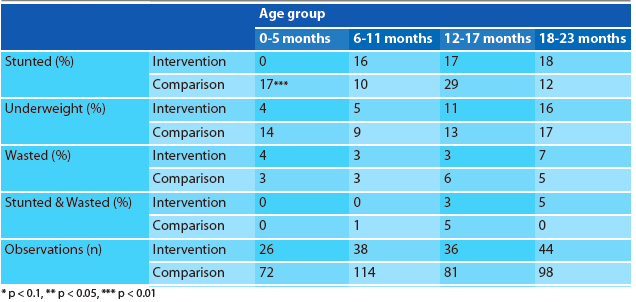 When disaggregated by age group (Table 3), it was observed that the prevalence of malnutrition was higher among older children compared to younger children in both intervention and comparison groups. There was no statistically significant difference between the two groups in terms of any of the types of malnutrition except stunting among children aged 0-5 months; there were no stunted infants in the intervention group, compared to 17% in the comparison group.