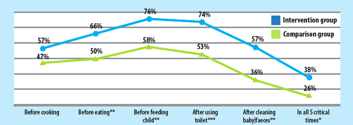 As messages relating to personal hygiene and appropriate hand-washing practices were an integral part of the SBCC module, the effect of the intervention on these practices was also evaluated. Results show that the intervention had a statistically significant positive impact on reported hand-washing practices. Overall, 38% of mothers from intervention villages reported washing their hands at all five critical times with water and soap, compared to 26% from the comparison group (P<0.1) (Figure 3).