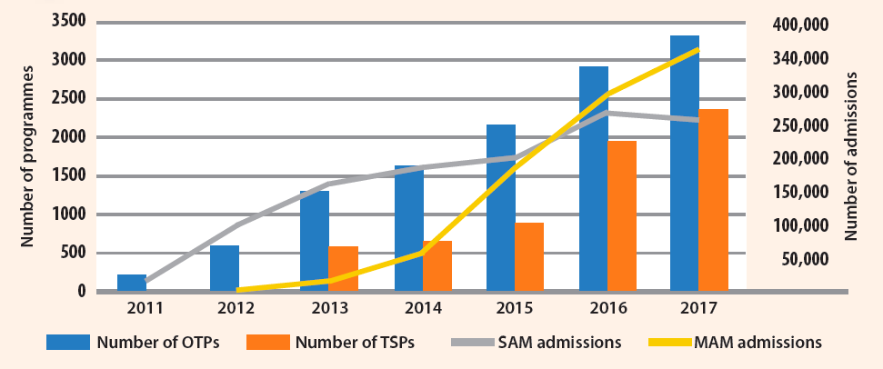 The programme has scaled up steadily since 2011, as shown in Figure 3. In 2017, 330 (11% more than in 2016) additional OTPs and 436 (22% more than in 2016) additional therapeutic supplementary feeding programmes (TSFPs) were established. Over half a million children were admitted to the CMAM programme in 2017, which is one quarter of the projected caseload. However, in spite of the geographical scale-up (72% and 48% for OTPs and TSFPs respectively), the number of admissions remained similar in 2017 compared to 2016 for both SAM and MAM treatment programmes (as per the data currently available in the Nutrition Cluster). In addition, TSFP scale-up did not match OTP scale-up, which explains the low admission rate of MAM cases from 2009 to 2016, even though MAM caseload is four to five times the SAM caseload (as shown in Figure 3).