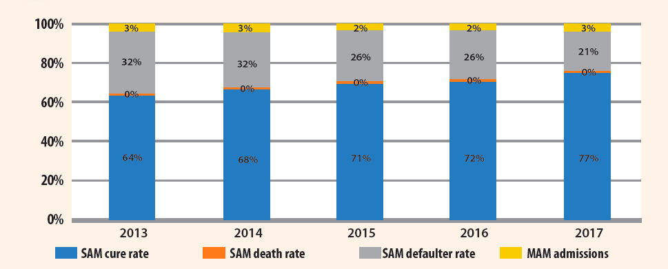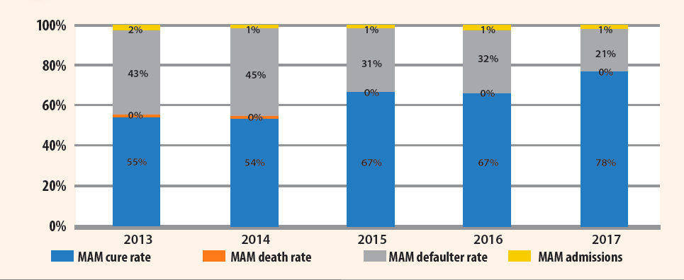 SAM cure rates increased significantly from 64% in 2013 to 77% in 2017 and the numbers of defaulters and deaths among children also reduced (Figure 4). Similarly, for MAM treatment, cure rates increased from 55% to 78% in the districts where the programmes were implemented, also due to decreased number of defaulters, which correlates with less stockouts of supplies (Figure 5).