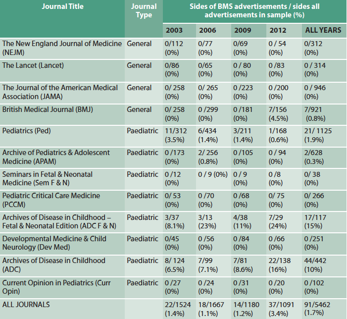 Of 63,167 pages searched in 12 journals (eight paediatric, four general), 5,462 (8.6%) were advertisements and 91/5462 (1.7%) of these were for BMS. Some journals carried no BMS adverts at all (Table 1); of five journals carrying BMS adverts, four were paediatric journals; one publishing group was responsible for almost 75% of all BMS advertising.