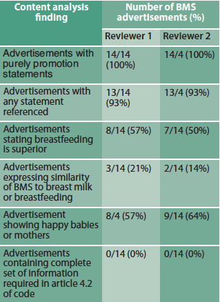 The 2012 sample contained 39 BMS advertisements, 14 of which were unique adverts. The reviewers agreed that all advertisements met the study definition of containing purely promotional statements and none contained all the information and warnings about BMS stipulated in Article 4.2 of the Code (Table 2).