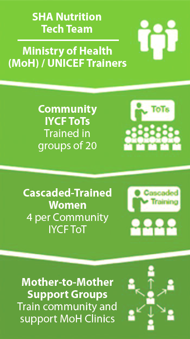 The core of this model is a combination of nutrition-sensitive and nutrition-specific interventions within agriculture programmes at community level, with a focus on women of reproductive age, infants and young children. Nutrition-specific interventions that can be undertaken at community level, which are key to the model promoted by SHA, include promotion of improved Infant and Young Child Feeding (IYCF) practices through the training of beneficiaries within the community and the formation of mother-to-mother support groups. Other interventions include support for vitamin A supplementation for children aged 6-59 months, supplied by health centre staff.