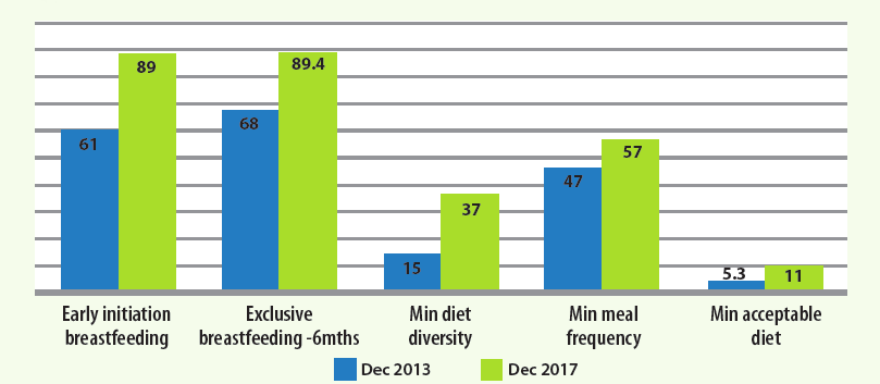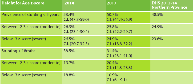 Several studies were completed to measure the impact of the various interventions in mid-2017, towards the end of the five-year programme. A repeat nutrition survey after two and a half years showed significant improvements in stunting trends among children under 18 months, with levels decreasing from 38.5% in November/December 2014 to 31.4% in April 2017 (Table 1). A change in the ratio of moderate to severe stunting was also observed. In the 2014 study the ratio of moderate to severe stunting was 1:1, while in 2017 this had changed to 2:1, meaning far fewer cases of severe stunting. Due to the overlap in confidence intervals it is not possible to say that the results are statistically significant. This may be due to two factors – the sample size of infants less than 18 months was small (119 in 2014 and 130 in 2017) and the timeframe was short between surveys (< 2.5 years).
