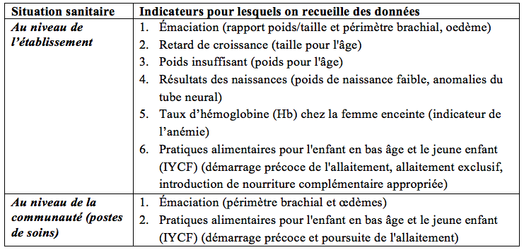 Tableau 1. Indicateurs pour lesquels on recueille des données via le système sentinelle de surveillance de la nutrition