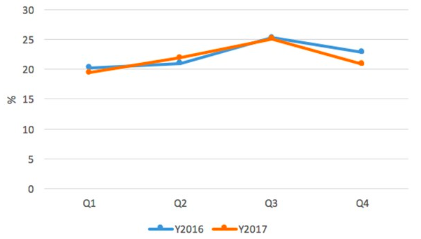 Des niveaux généralement élevés de malnutrition aiguë ont été observés chez les enfants de moins de deux ans dans les sites sentinelles au niveau des centres de soins. Ces mêmes tendances ont été observées au niveau de la communauté (Schéma 5). Des tendances cycliques se dégagent: des niveaux importants de malnutrition aiguë sont observés au 3ème trimestre, et les plus faibles au 1er trimestres. En 2017 les niveaux de malnutrition étaient légèrement moins élevés. Les raisons pour lesquelles les enfants et leurs proches se rendent dans les établissements (et sont ensuite dépistés) sont variées: visites pour le traitement d'une maladie, vaccinations, suivi de la croissance et sa promotion, soins prénataux ou contraception. Les enfants dépistés le sont donc de manière aléatoire, avec la possibilité d'un biais non mesuré par rapport aux visites des nourrissons malades.