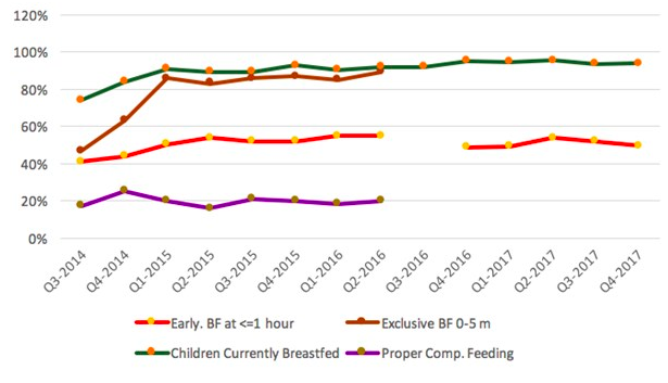Des données complètes concernant l'IYCF ont été recueillies dès 2014 et de manière continue jusqu'aux derniers changements effectués au 3ème trimestre 2016, lorsqu'il fut décidé de réduire le nombre d'indicateurs pour l'IYCF. La raison évoquée pour la suppression de deux indicateurs majeurs, l'allaitement exclusif et l'alimentation complémentaire appropriée, est qu'il y a un manque de données fiables en raison du temps considérable requis pour collecter ces informations dans les établissements de soins de routine. Les taux initialement rapportés d'allaitement exclusif étaient faibles (1er et 2ème trimestre 2014), augmentant au-delà de 80 % entre le 1er trimestre 2015 et le 2ème trimestre 2016, lorsque la collecte de données s'est arrêtée. La proportion d'alimentation complémentaire appropriée tournait régulièrement autour de 20 %. Des tendances relativement uniformes furent observées durant la période du rapport. La plupart des femmes déclaraient déclencher l'allaitement dans les premières 24 heures. Des fluctuations marginales furent observées, comme par exemple au 4ème trimestre 2017, 49,7 % des nourrissons furent allaités dans l'heure suivant l'accouchement, pour 52,1 % au 3ème trimestre de la même année. À part ça, le pourcentage a été plus ou moins le même entre 2016 et 2017. La proportion de nourrissons allaités durant la première heure était faible entre le 3ème trimestre 2014 et le 1er trimestre 2015, alors qu'une augmentation régulière a été enregistrée. Un total de 93,7 % des nourrissons de moins de deux ans étaient encore allaités (estimation faite selon la définition de la norme de l'OMS pour le taux d'allaitement continu des nourrissons âgés de 20 à 23 mois). Cela a été une constante durant toute la période contrôlée, du 1er trimestre 2016 au 4ème trimestre 2017. Aucunes données ne furent recueillies durant les 2ème et 3ème trimestres de 2016 concernant le démarrage de l'allaitement en raison d'une révision des outils d'evaluation. Cela a été repris au 4ème trimestre 2016, une fois décidé par consensus de garder l'indicateur.