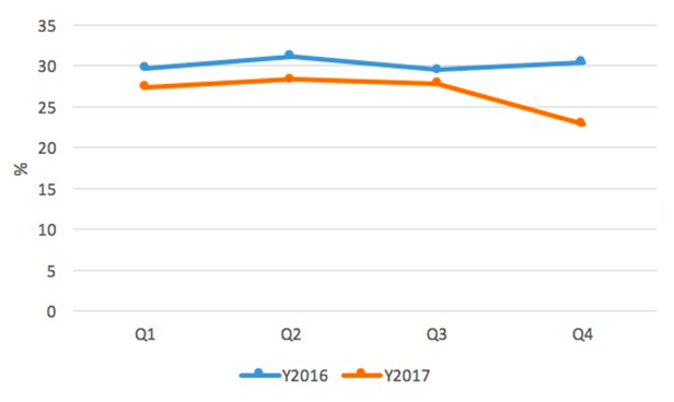 Le statut Hb a été évalué pour toutes les femmes enceintes se rendant à leurs sites sentinelles qui fournissent des services de maternité. On a pu observer une plus grande proportion de déficience en Hb (niveau inférieur à 11g/dl) pour les grossesses avancées (supérieures ou égales à 24 semaines) que pour les moins avancées (moins de 24 semaines). La proportion de femmes enceintes avec un niveau de Hb inférieur à 11g/dl était constant durant la période étudiée, atteignant un pic de 31,1 % au 4ème trimestre 2017, et un minimum de 26 % pour les 1er et 2ème trimestres de 2016. D'autres tendances par stade de grossesse sont illustrées sur le graphique 9.