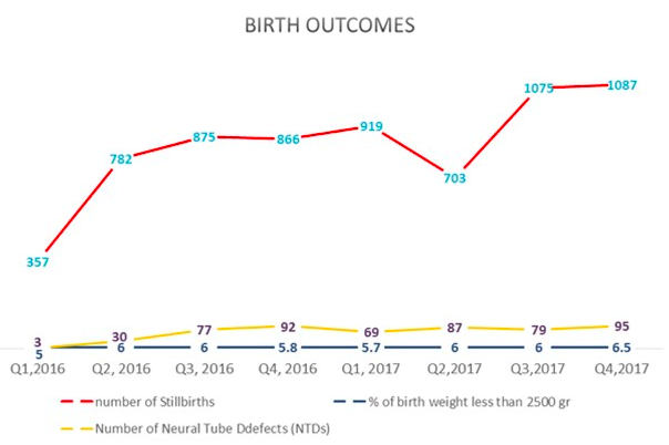 Les conséquences à la naissance furent rapportées pour tous les accouchements ayant eu lieu dans les sites sentinelles offrant des services de maternité. La proportion de nourrissons nés avec un poids de naissance faible était plutôt uniforme durant la période étudiée, tournant autour de 6 % sauf pour le 4ème trimestre 2017, ou elle a légèrement augmenter à 6,5 %. Les anomalies du tube neural (ATN) étaient répandues, avec des tendances à la hausse au cours de la période observée. Un pic de 95 cas a été rapporté au 4ème trimestre 2017 (une augmentation par rapport aux 79 cas du 3ème trimestre 2017), sur un total de 33 239 naissances enregistrées dans les maternités inscrites pour la surveillance. Le nombre le plus faible de cas, 3 au 1er trimestre 2016, est dû à un manque de signalement durant la phase initiale de l'intervention, causé par des définitions de cas non-standardisées, qui ont été améliorées par la suite, au cours de la période observée. Les ATN (anomalies du tube neural, comme le spina-bifida, l’encéphalopathie ou l'anencéphalie) sont étroitement liés à la déficience en acide folique.