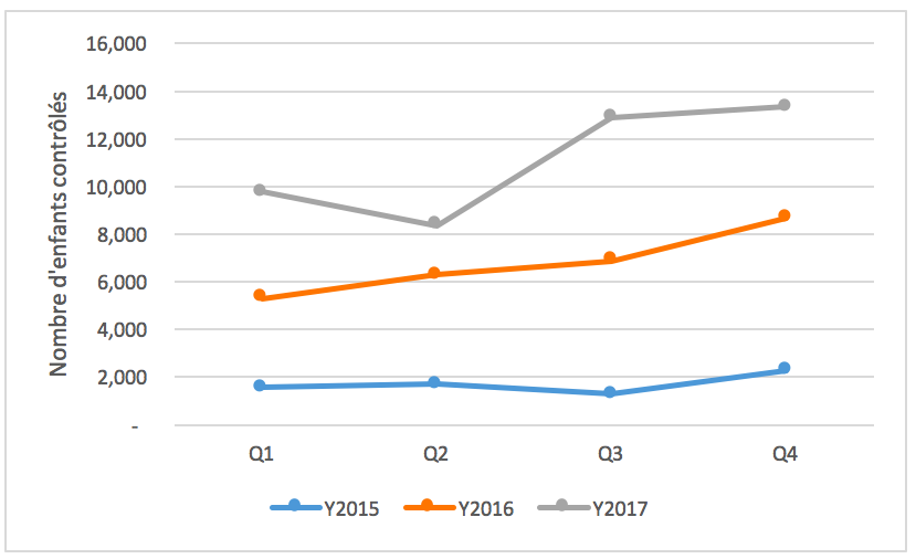 En 2017, une moyenne de 11 095 enfants par trimestre, issus de 868 postes de soins communautaires, ont été dépistés, soit une augmentation par rapport à 2016 (6 789) et 2015 (1 710). Il y a eu moins de rapports de la part des sites communautaires (540) lors de la phase initiale de mise en oeuvre (2015-2016), l'adoption fut un peut moins rapide au sein de la communauté comparé aux établissements de santé.