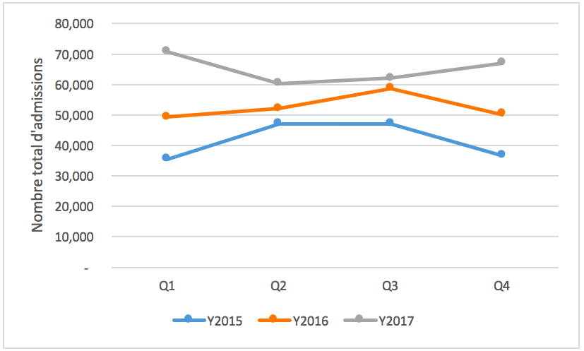 Sur les sites des établissements de soins le nombre de dépistage a atteint en moyenne 22 050 enfants par trimestre sur 175 centres en 2017, contre 18 649 en 2016, 6 718 en 2015 et 3 784 en 2014. On s'attend à un plus grand nombre de dépistage d'enfants dans les établissements de soins, vu que les enfants visitant directement les centres ainsi que ceux ayant été référés par la communauté sont inclus. Ils ne sont parfois pas originaires de la circonscription de l’établissement. Les nombres croissants observés reflètent également l'approche par phase du processus d'agrandissement : 10 provinces en 2014, 22 en 2015, et en 2016 l'ensemble des 34 provinces étaient incluses. Une analyse des données des malades hospitalisés souffrant de MAS (les cas compliqués) du système informatisé de gestion sanitaire (HMIS-DHIS2) montre une augmentation générale du nombre d'admissions au fil des ans (schéma 3). Cependant, un résultat plus nuancé a pu être observé : alors qu'en 2015 le plus fort taux d'admissions avait été atteint au 2ème trimestre, pour 2016 ce fut au 3ème trimestre, alors qu'en 2017 le plus fort taux fut rapporté au 1er trimestre.