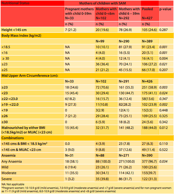 Results are presented for all mothers, in three stratified categories: those who were pregnant and had a SAM child aged 0-59 months (n=33); non-pregnant mothers with a SAM child aged less than six months (n=102); and non-pregnant mothers with a SAM child aged 6-59 months (n=292). Chi-square test was used to compare the nutritional status of mothers between the three groups.