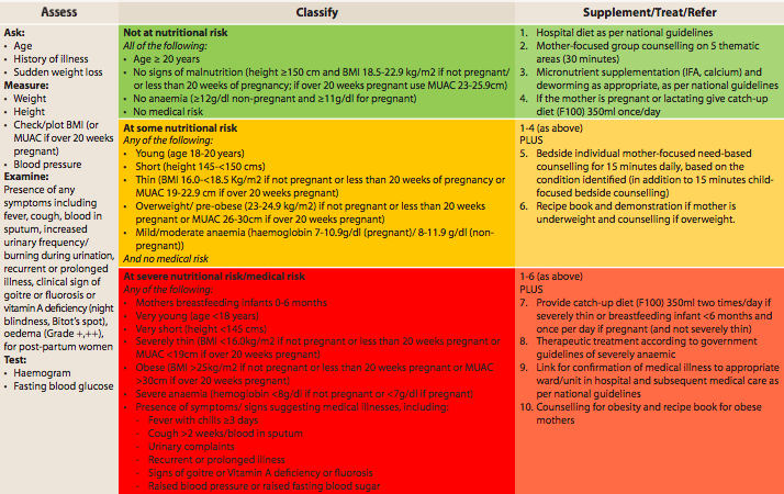 In addition to universal interventions and those targeted to mothers at some nutritional risk, extra support is provided to mothers deemed to be at severe nutritional or medical risk (see Table 2 for criteria). Several options for an enhanced energy-dense supplement were developed but, after pre-testing with mothers, F-1002 was found to be the most feasible as it is already provided to the SAM child after stabilisation (for ‘catch-up’ growth) and therefore no extra cooking and ingredients were required. F-100 (350ml) is provided once per day to pregnant mothers and twice per day (700ml) to mothers breastfeeding infants under six months of age and severely thin mothers to cover estimated additional energy requirements. Therapeutic treatment is provided to women with severe anaemia as per government guidelines. Many of these mothers also have other signs of underlying illness (such as TB) and are referred to respective wards for treatment.