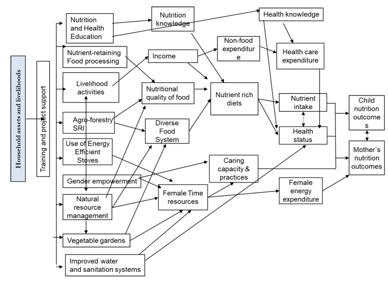 Informed by the findings, a theory of change (ToC) was developed for outcomes of the HPC combination of interventions (Figure 1). The ToC shows clearly how the different HPC approaches interact and converge to build potential for improved nutrition. Women’s time is saved through a combination of activities, including technologies, environmental improvement and supply of basic services such as water and animal fodder. Food systems are diversified through agroforestry, natural resource management and fruit and vegetable gardens. Income can be used to improve nutrition or for purchase of highly processed foods that are not nutrition-enhancing. Nutrition and health education can be used to modify this effect.