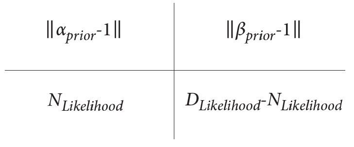 Figure 2 shows the scatterplot of prior modes against likelihood modes. Prior modes and likelihood modes were positively associated with each other. Pearson’s correlation coefficient was r = 0.73 (95% CI = 0.67; 0.78). This is very strong evidence (p < 0.0001) against the null hypothesis that prior modes and likelihood modes are not associated with each other. The slope of the regression line was β = 0.55 (95% CI = 0.49; 0.61).