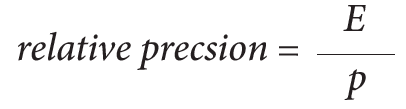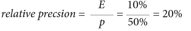 A coverage estimate of 50% (p) with a 95% confidence interval of ± 10% (E) has relative precision: