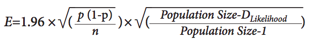The half-width of 95% confidence intervals (E) for the likelihood modes (p) were calculated using the normal approximation and applying a finite population correction (i.e. because severe acute malnutrition is a rare condition) for each SQUEAC coverage assessment for which a priorlikelihood conflict was detected: