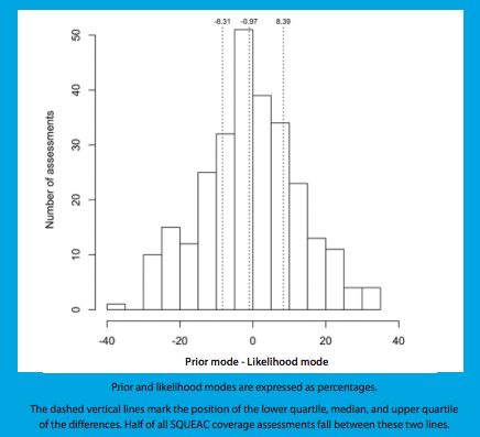 The distribution of differences between the prior mode was symmetrical about a central value. This is not consistent with a systematic bias (in either direction) in prior modes. There is a tendency for the prior to overestimate coverage when true coverage is low and to underestimate coverage when true coverage is high. Prior-likelihood conflicts followed this pattern. Prior-likelihood conflicts were detected in 7.30% of the 274 SQUEAC assessments but led to coverage estimates with poor precision in only 2.25% of the 274 SQUEAC assessments. Prior-likelihood conflicts in which the prior mode was below the likelihood mode were equally as common as prior-likelihood conflicts in which the prior mode was above the likelihood mode. These findings indicate that there is no general and systematic failure in SQUEAC.
