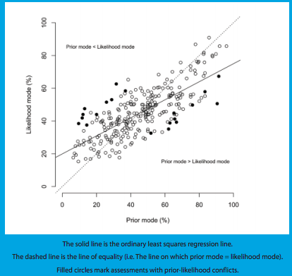 The magnitude of Pearson’s correlation coefficient (r = 0.73. 95% CI = 0.67; 0.78) might be typified as indicating only a moderately strong association. It is, however, unrealistic to expect a stronger association between informed guesses (i.e. prior modes) and estimates (i.e. likelihood modes) made using small sample likelihood data. The nature of the prior mode (i.e. an informed guess) and the likelihood mode (i.e. an estimate made using a small sample size subject to considerable sampling variation) makes finding a stronger association between them extremely unlikely.